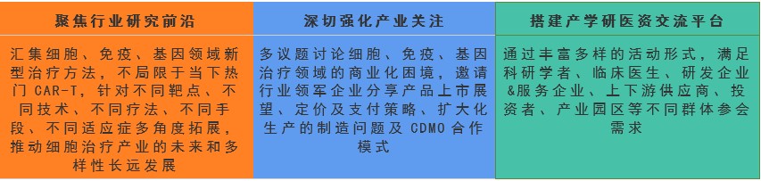 本屆大會(huì)誠(chéng)邀國(guó)內(nèi)外領(lǐng)先學(xué)術(shù)科研機(jī)構(gòu)、大型醫(yī)院、產(chǎn)業(yè)鏈上下游企業(yè)、國(guó)家監(jiān)管機(jī)構(gòu)、產(chǎn)業(yè)園區(qū)、投資機(jī)構(gòu)、行業(yè)協(xié)會(huì)等專業(yè)人士共聚上海,分享行業(yè)進(jìn)展動(dòng)態(tài),探討產(chǎn)業(yè)發(fā)展瓶頸及細(xì)胞治療和基因治療的未來(lái)之路!