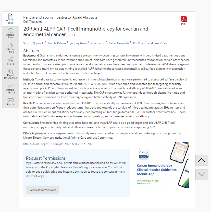 摘要標(biāo)題:Anti-ALPP CAR-T cell immunotherapy for ovarian and endometrial cancer 用于人體內(nèi)卵巢癌和子宮內(nèi)膜癌的抗 ALPP 的CAR-T 細胞免疫療法