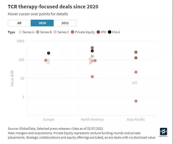 然而在2021年上半年,歐洲卻很少有開發(fā)商對TCR-T進(jìn)行風(fēng)險投資,同樣在亞洲也是如此。但是這一現(xiàn)象與美國形成鮮明對比,美國至少獲得了三輪由TCR-T公司的籌集的風(fēng)險投資,并且TCR-T開發(fā)商在美國也進(jìn)行了多次首次公開募股。最近一次是TScan Therapeutics以8500萬歐元的價格完成資金募集。