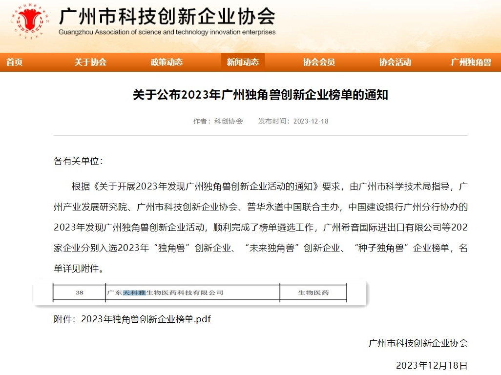 根據(jù)廣州市科技創(chuàng)新企業(yè)協(xié)會網(wǎng)12月18日《關(guān)于公布2023年廣州獨角獸創(chuàng)新企業(yè)榜單的通知》內(nèi)容所示,天科雅入選2023年“未來獨角獸”創(chuàng)新企業(yè)榜單。