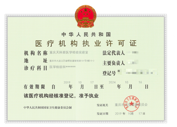 經(jīng)過(guò)專家組成員現(xiàn)場(chǎng)評(píng)定及文件審查,天科雅醫(yī)學(xué)檢驗(yàn)室順利通過(guò)驗(yàn)收。重慶市衛(wèi)生健康委員會(huì)于2019年10月17日,頒發(fā)《醫(yī)療機(jī)構(gòu)執(zhí)業(yè)許可證》,診療科目為醫(yī)學(xué)檢驗(yàn)科。