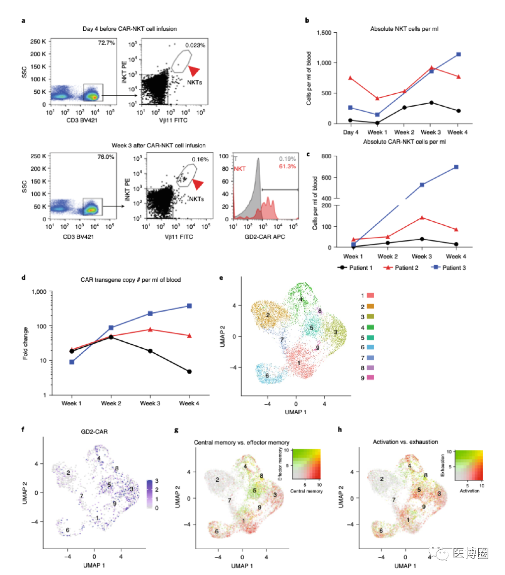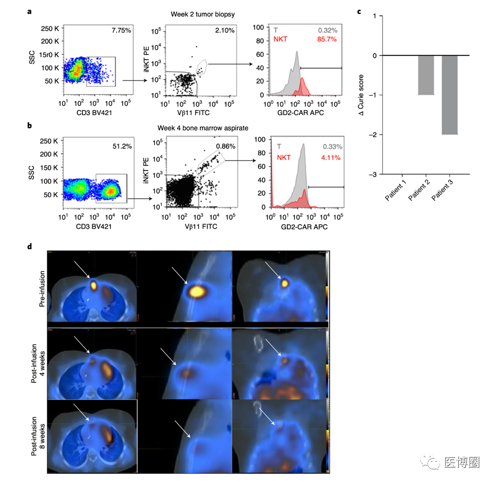 a 通過流氏細(xì)胞檢測技術(shù),病人3在輸入NKT細(xì)胞之前,之后的NKT細(xì)胞的比例,以及周邊血樣本GD2-CAR的表達(dá)。在輸入NKT細(xì)胞4天前的CAR-NKT細(xì)胞比例是0.023%,輸入CAR-NKT細(xì)胞3個星期之后,NKT細(xì)胞比例提升到了0.16%。柱形圖展現(xiàn)了在輸入NKT細(xì)胞三個星期之后,CAR的表達(dá)(紅色,61.3%)和陰性對照(灰色,0.19%)相比。